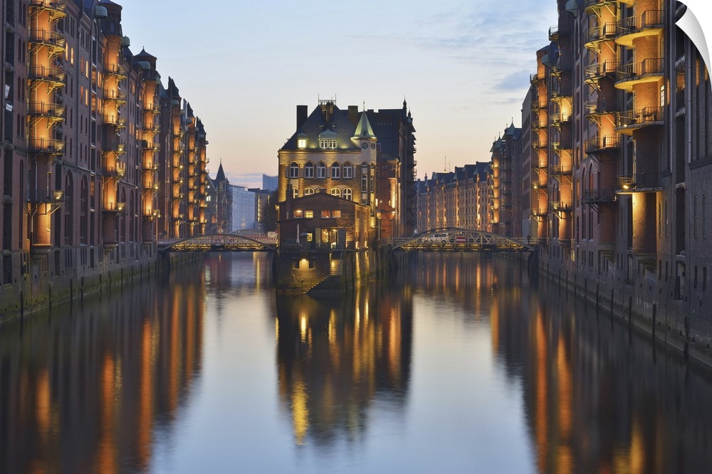 <p>View of Speicherstadt with River Elbe at Dusk, Hamburg, Germany</p>