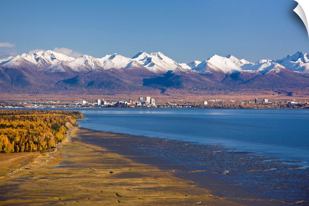 <p>Aerial view of the Anchorage skyline looking southeast from Point Mackenzie over Knik Arm with the Chugach Mountains in the background during Fall, Southcentral Alaska</p>