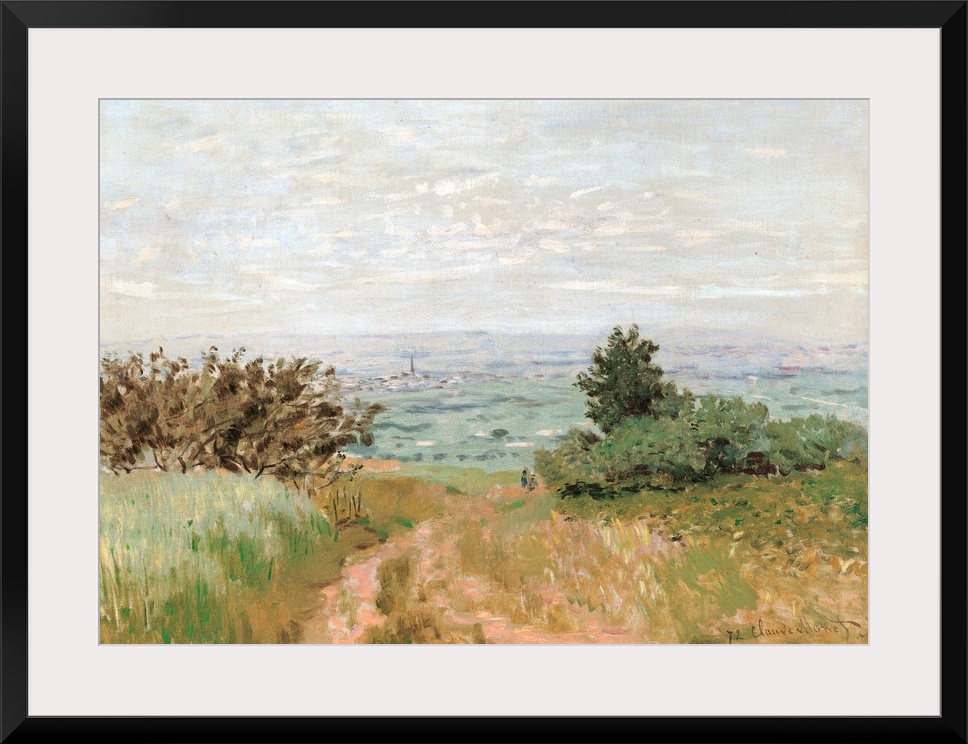 <p>View of the Argenteuil Plain from the Sannois Hill, by Claude Monet, 1872, 19th Century, oil on canvas, cm 52 x 72 - France, Ile de France, Paris, Muse dOrsay. All. Plain hill way street path bush grass green Argenteuil light blue azure meadow. (257506) E</p>