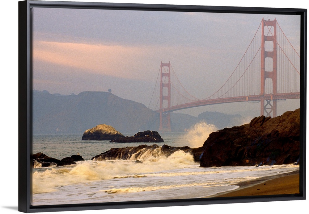 <p>From the National Geographic Collection a landscape photograph of waves crashing on a rocky shore with famous bridge and bay in the background.</p>