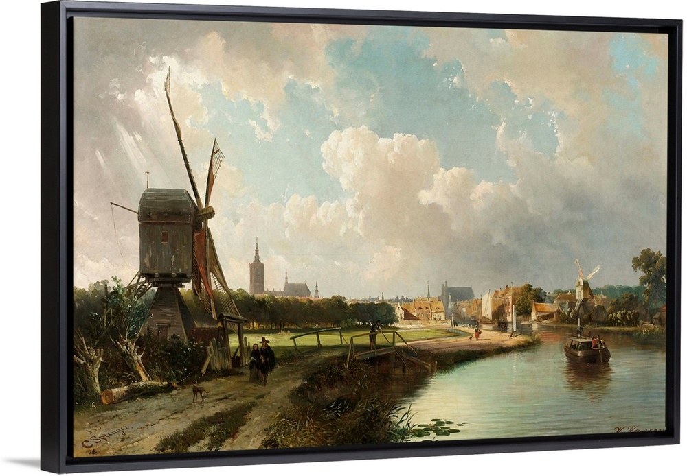 <p>View of The Hague from the Delft Canal in 17th Century, by Kasparus Karsen, and his student, Cornelis Springer, 1852. Dutch 19th century, oil on canvas. Springer was about 17 years old when this painting was completed. a windmill and pedestrians in 17th century costume walk on a bridged road by a windmill. Other details include a man fishing and a canal barge.</p>