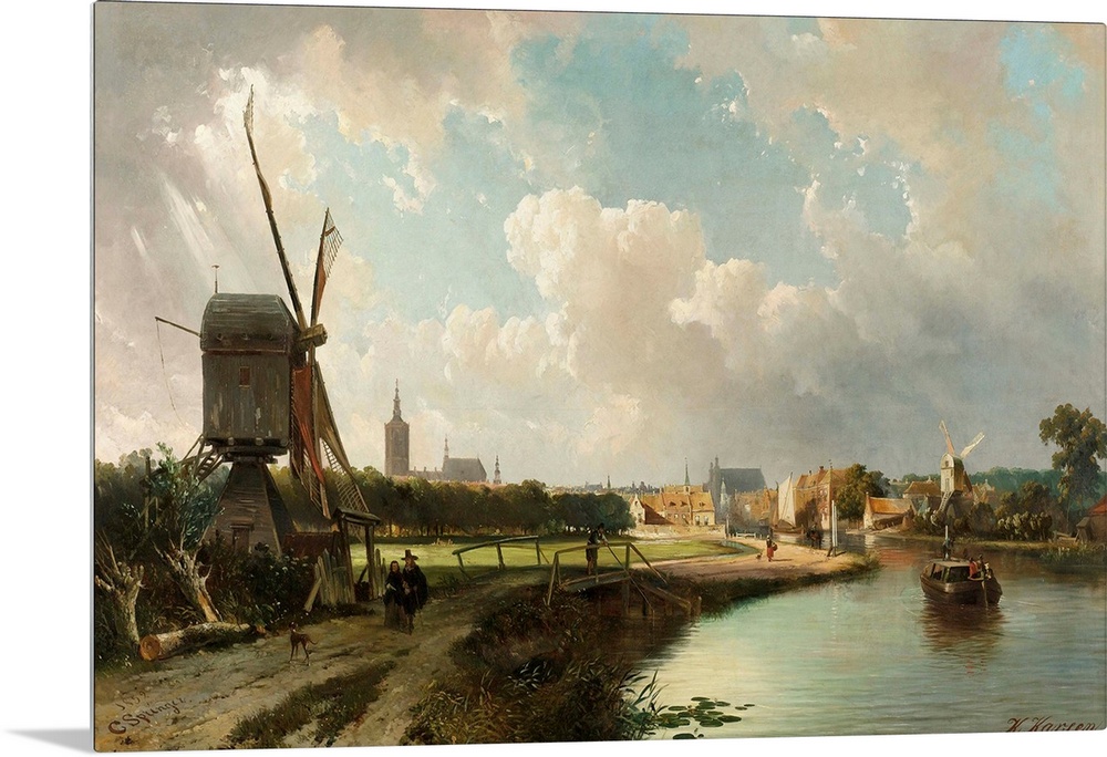 <p>View of The Hague from the Delft Canal in 17th Century, by Kasparus Karsen, and his student, Cornelis Springer, 1852. Dutch 19th century, oil on canvas. Springer was about 17 years old when this painting was completed. a windmill and pedestrians in 17th century costume walk on a bridged road by a windmill. Other details include a man fishing and a canal barge.</p>