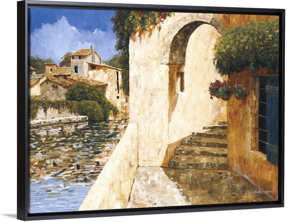<p>Contemporary painting of an archway in a village near the water.</p>