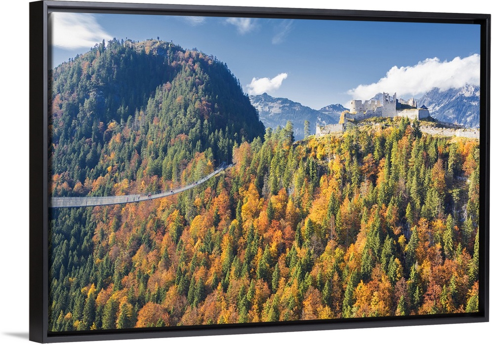 <p>View of the old Ehrenberg Castle surrounded by colorful woods and suspension bridge, Highline 179, Reutte, Austria</p>