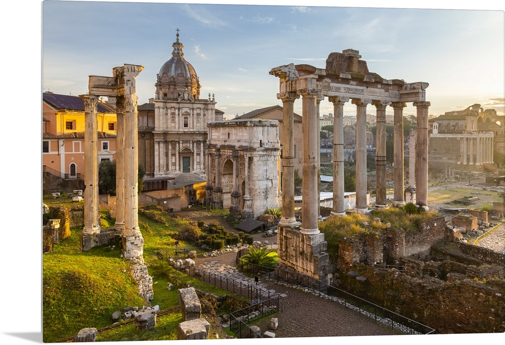 <p>View of the ruins of Fori Imperiali from the Campidoglio at dawn. Rome, Rome district, Lazio, Italy.</p>