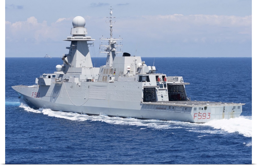 <p>View of the stern of Italian Navy frigate Carabiniere.</p>