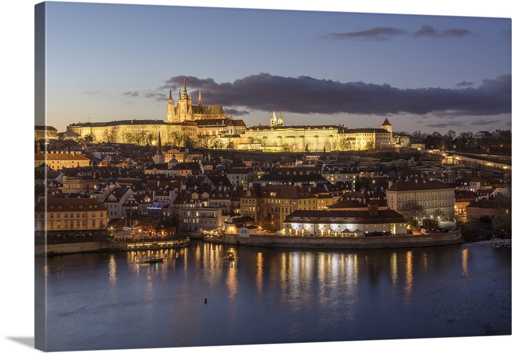 <p>View of the Vltava River framed by historical buildings at dusk, Prague, Czech Republic</p>