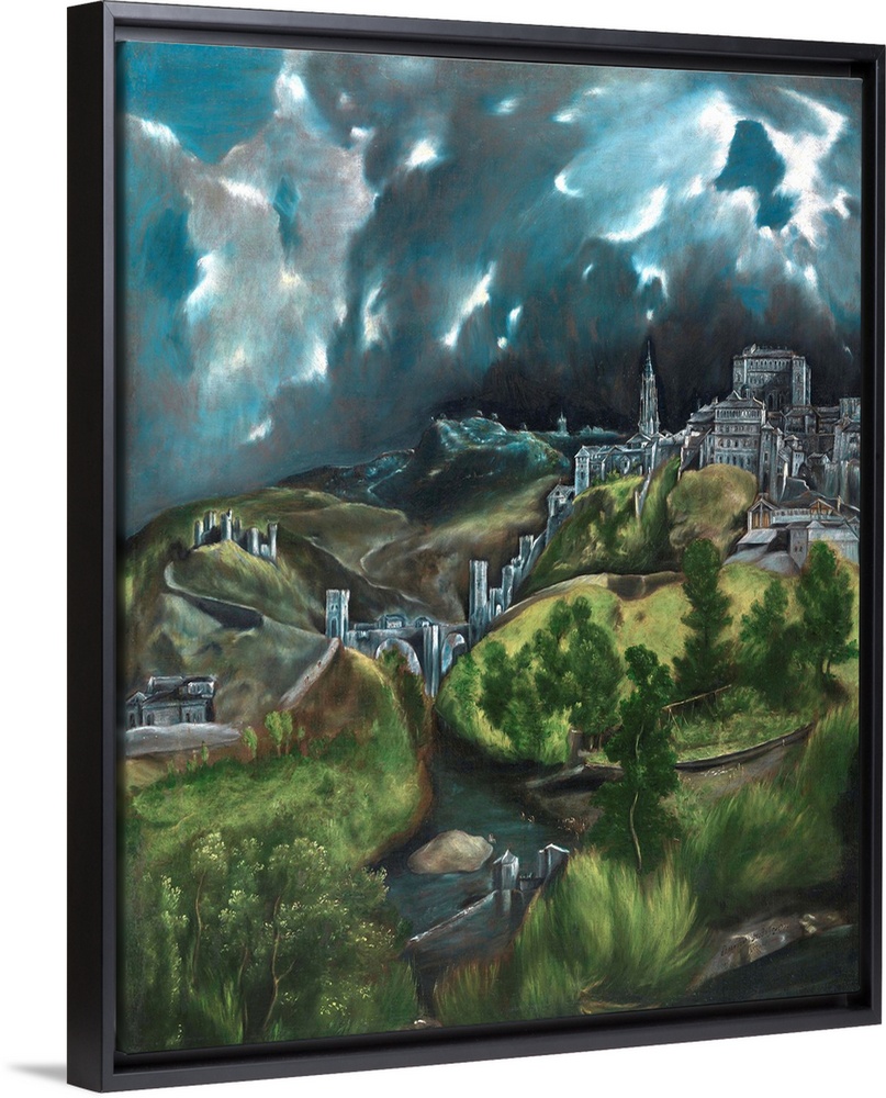 <p>In this, his greatest surviving landscape, El Greco portrays the city he lived and worked in for most of his life. The painting belongs to the tradition of emblematic city views, rather than a faithful documentary description. The view of the eastern section of Toledo from the north would have excluded the cathedral, which the artist therefore imaginatively moved to the left of the Alcazar (the royal palace). Other buildings represented in the painting include the ancient Alcantara Bridge, and on the other side of the river Tagus, the Castle of San Servando.</p>