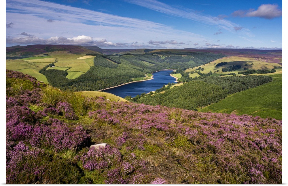 <p>View of Upper Derwent Reservoir and flowering heather in August from Derwent Edge, Peak District National Park, Derbyshire, England, United Kingdom, Europe</p>