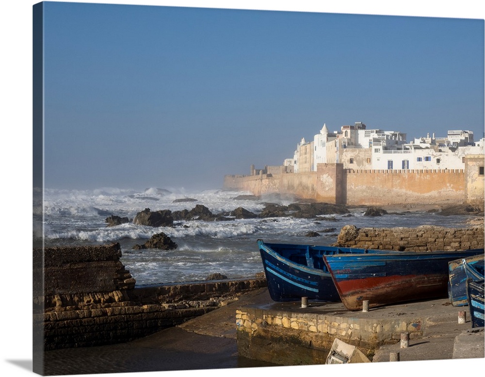 <p>View of wall around medina with waves crashing against wall, Essaouira, Morocco</p>