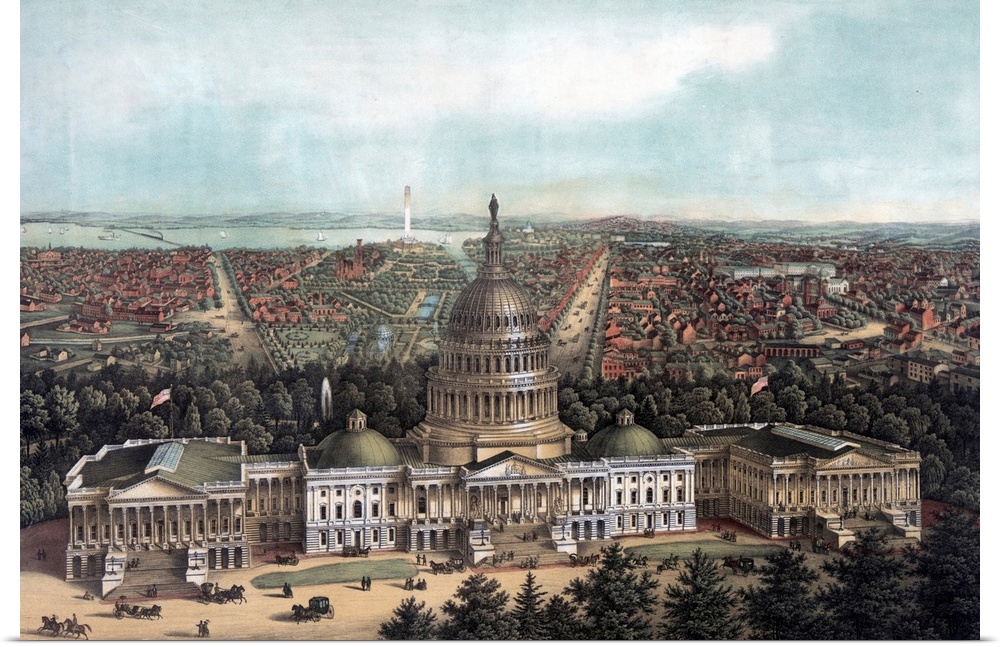<p>View of Washington City by Lithographer E Sachse & Co. Chromolithograph. Print showing a bird's eye view of Washington D.C. with the U.S. Capitol in the foreground, the U.S. Botanic garden, Smithsonian Institute and the Washington Monument in the background.</p>