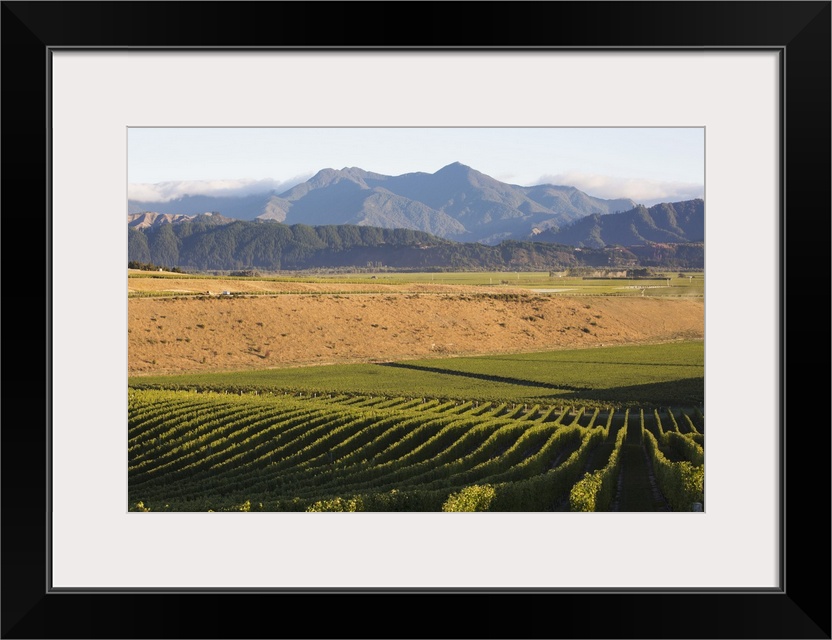 <p>View over typical vineyard in the Wairau Valley, early morning, Renwick, near Blenheim, Marlborough, South Island, New Zealand, Pacific</p>