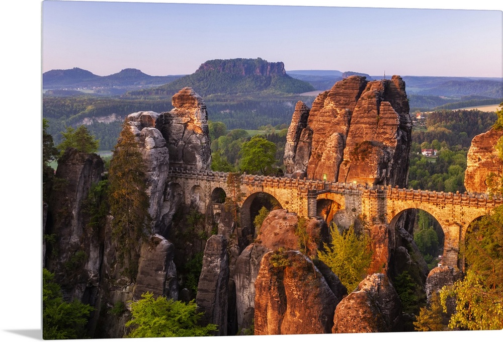 <p>View over the Bastei bridge to the Lilienstein, Elbe Sandstone Mountains, National Park Saxon Switzerland, Saxony, Germany, Europe.</p>