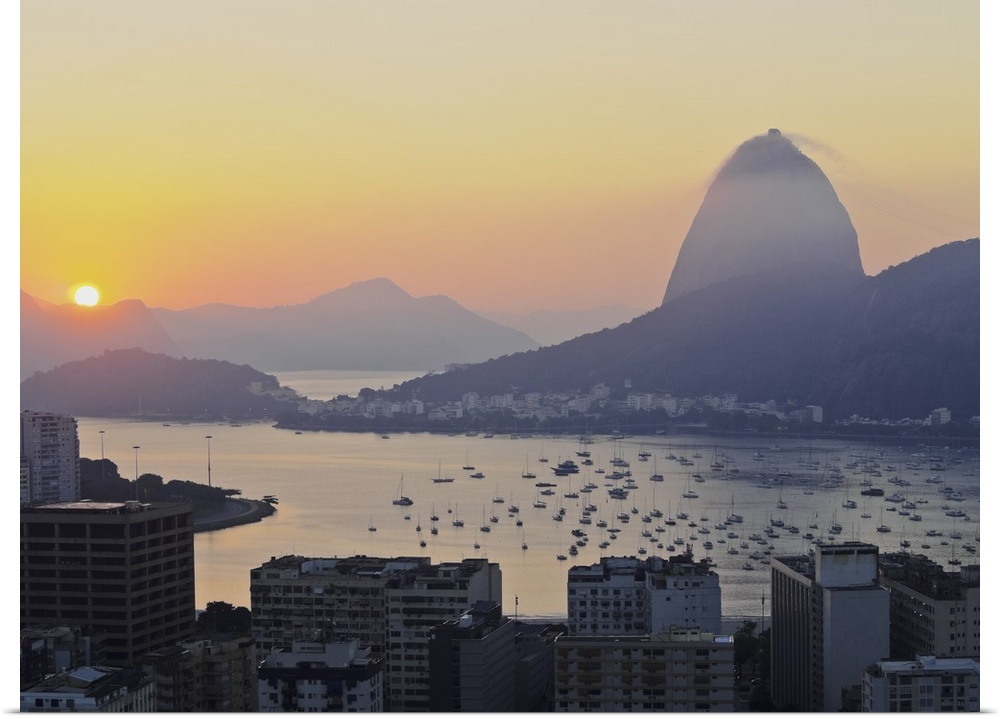 <p>View over Botafogo Neighbourhood towards the Sugarloaf Mountain at sunrise, Rio de Janeiro, Brazil, South America</p>