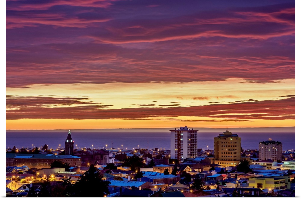 <p>View over city towards Strait of Magellan at sunrise, Punta Arenas, Magallanes Province, Patagonia, Chile.</p>