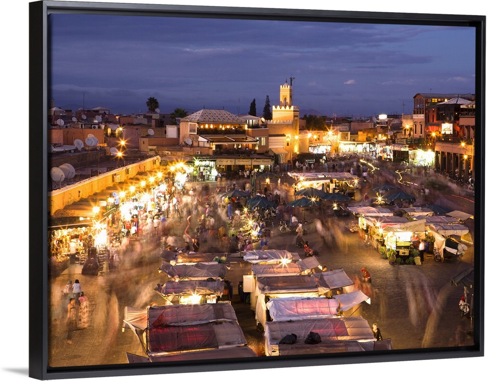 <p>View over Djemaa el Fna at dusk with foodstalls and crowds of people, Marrakech, Morocco, North Africa, Africa</p>