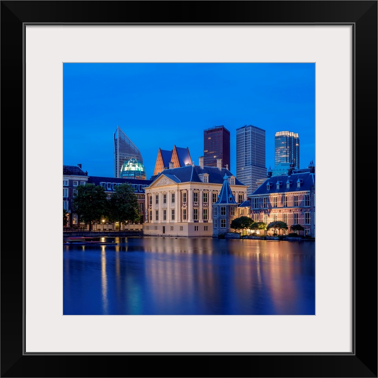 <p>View Over Hofvijver Towards Mauritshuis Art Museum And City Center, Twilight, The Hague, South Holland, The Netherlands</p>