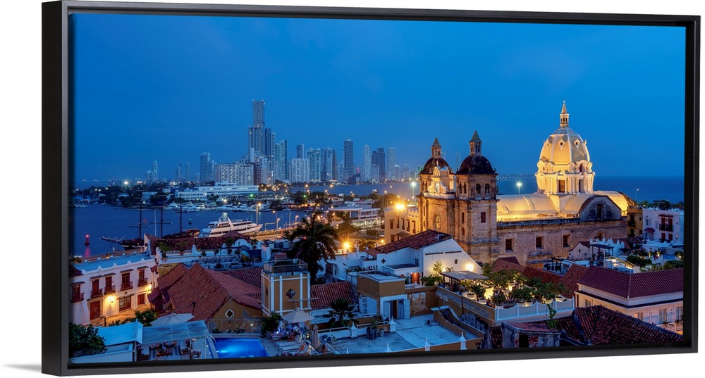 <p>View over Old Town towards San Pedro Claver Church and Bocagrande at dusk, Cartagena, Bolivar Department, Colombia.</p>