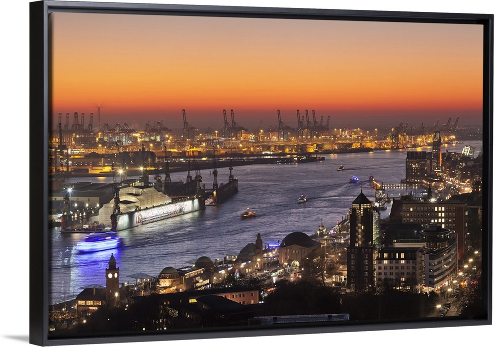 <p>View over St. Pauli district and St. Pauli Landungsbruecken pier over the harbour at sunset, Hamburg, Hanseatic City, Germany</p>