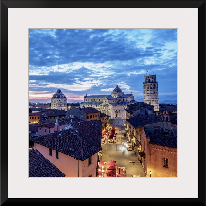 <p>View over Via Santa Maria towards Cathedral and Leaning Tower at dusk, Pisa, Tuscany, Italy.</p>