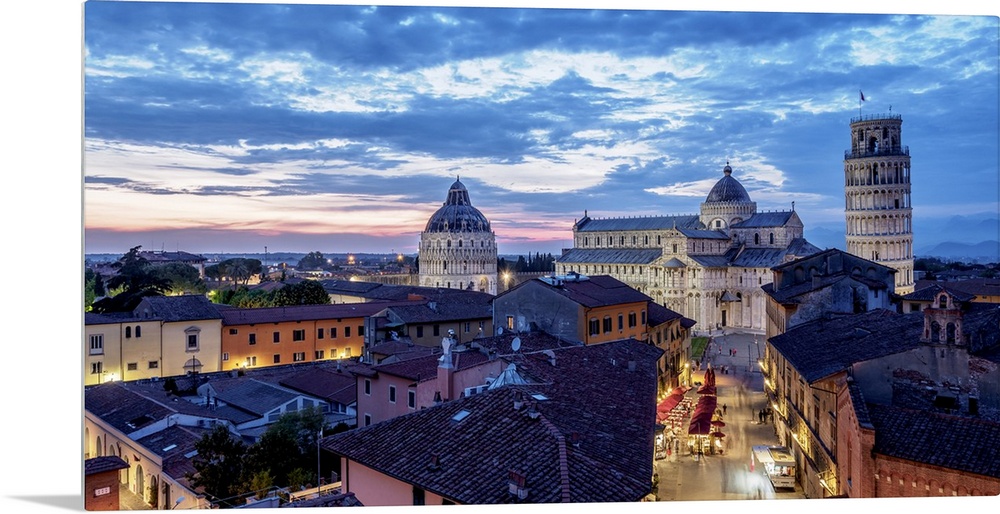 <p>View over Via Santa Maria towards Cathedral and Leaning Tower at dusk, Pisa, Tuscany, Italy.</p>