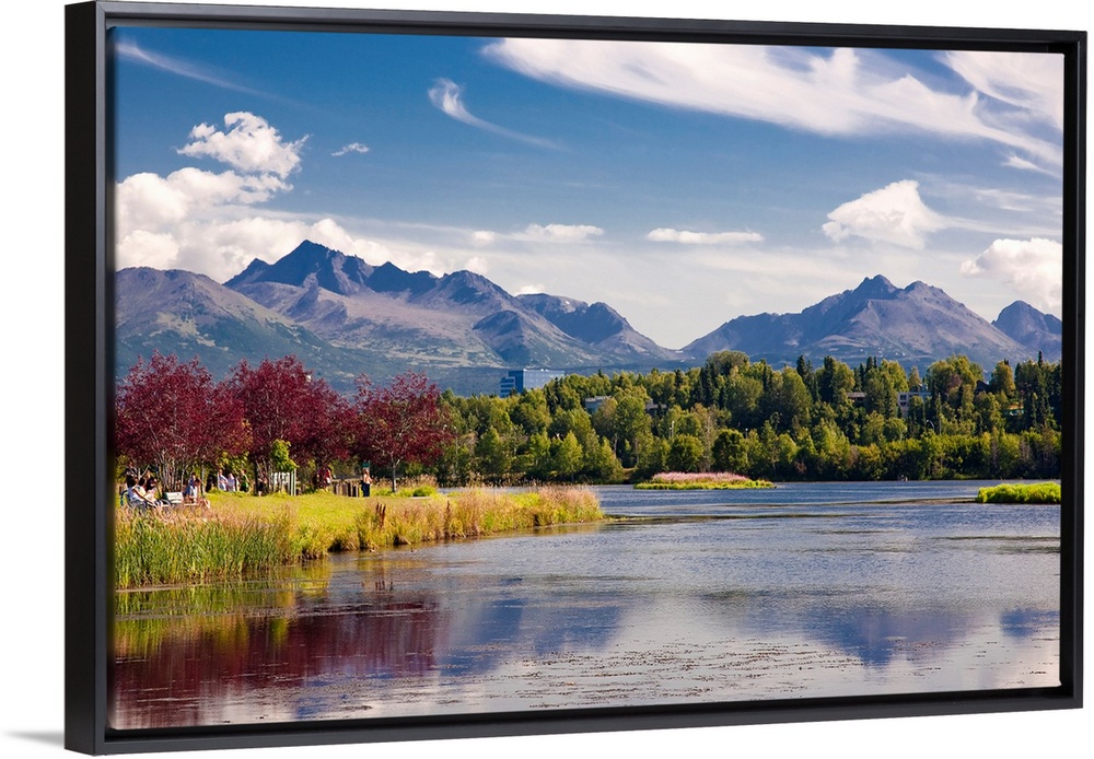 <p>Giant, landscape photograph of the Westchester Lagoon in the summer, surrounded by trees, and the Chugach Mountains in the background, in Anchorage, Southcentral Alaska.</p>