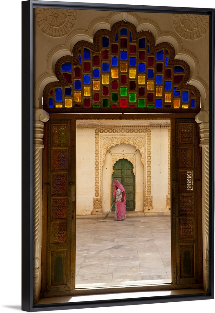 <p>View through doorway of woman sweeping, Meherangarh Fort, Jodhpur, Rajasthan, India</p>