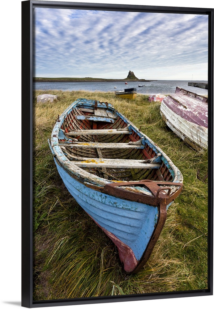 <p>View towards Lindisfarne Castle with an old blue and red fishing boat in the foreground, Lindisfarne (Holy Island), Northumberland, England, United Kingdom, Europe</p>