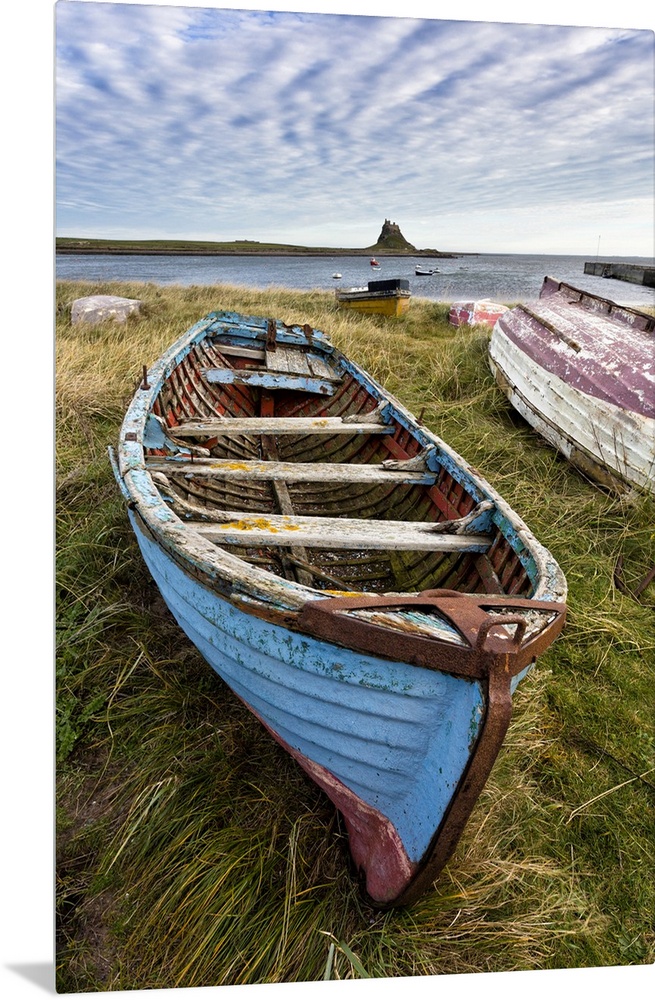 <p>View towards Lindisfarne Castle with an old blue and red fishing boat in the foreground, Lindisfarne (Holy Island), Northumberland, England, United Kingdom, Europe</p>