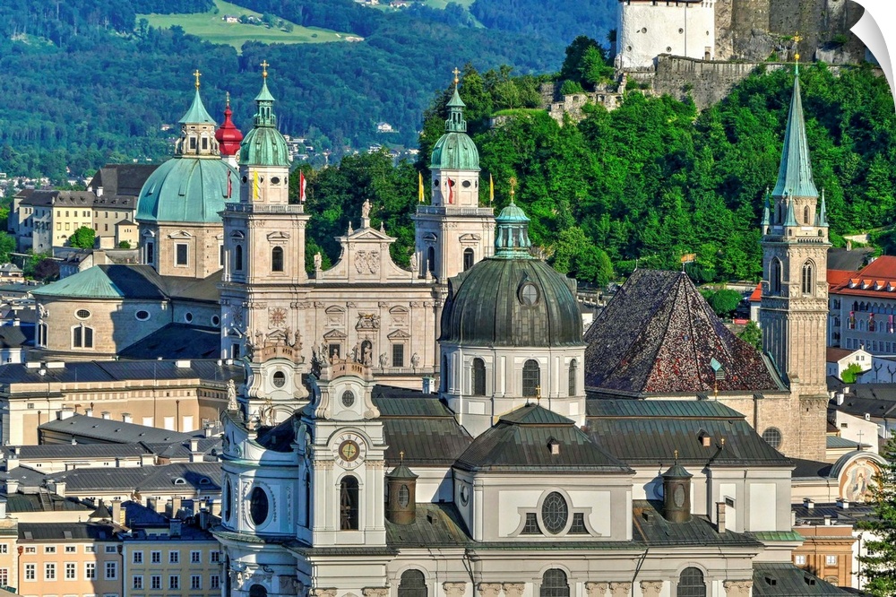 <p>View towards Salzburg Cathedral, Collegiate Church and Fortress Hohensalzburg, Salzburg, Austria</p>