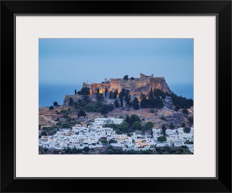 <p>View towards the Acropolis of Lindos at dusk, Rhodes Island, Dodecanese, Greek Islands, Greece, Europe</p>
