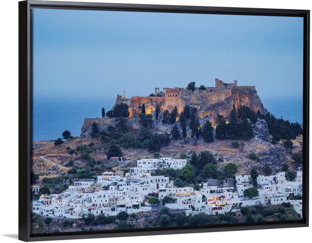 <p>View towards the Acropolis of Lindos at dusk, Rhodes Island, Dodecanese, Greek Islands, Greece, Europe</p>
