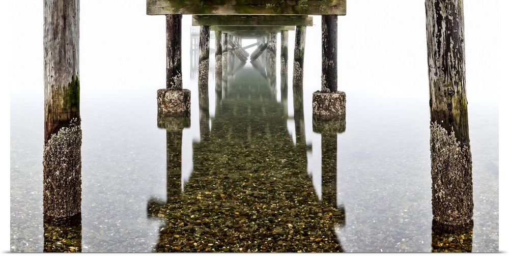 <p>View underneath the pier on foggy crescent beach to the reflection on the shallow, clear water, surrey, British Columbia, Canada.</p>