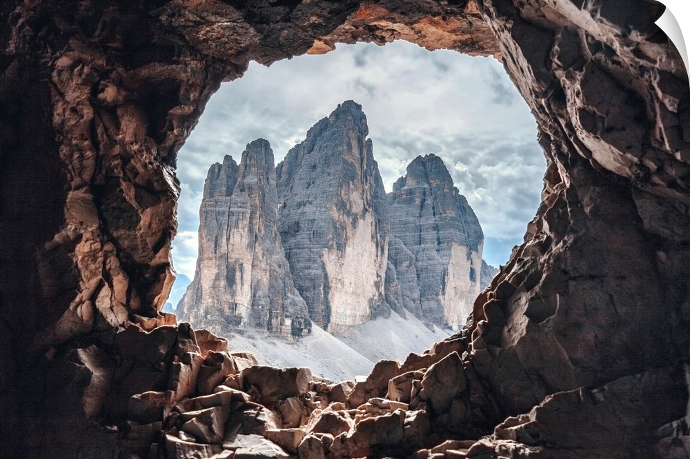 <p>Tre Cime Di Lavaredo (Drei Zinnen) Views From A Hole In The Rock Of The First World War, Dolomites, Auronzo Di Cadore, Belluno, Veneto, Italy.</p>