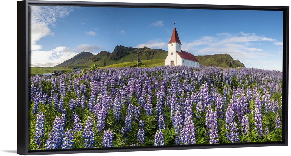 <p>Vik i Myrdal, Southern Iceland. Fields of lupins in bloom and the town church.</p>