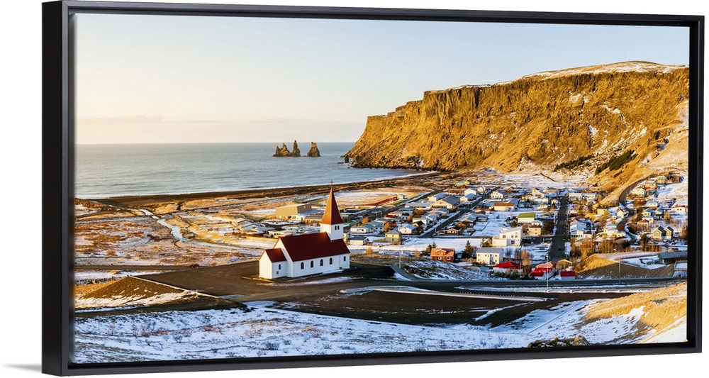 <p>Vik i Myrdal, Southern Iceland, Iceland. Panoramic high angle view over Vik's church, the village, and the Reynisdrangar rocks at sunrise.</p>