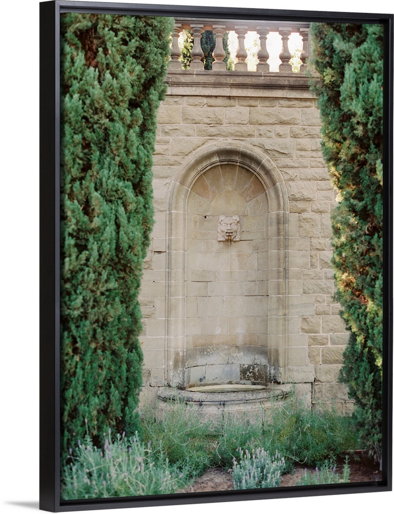 <p>A photograph of an ornate fountain set into the wall amidst elegant gardens of a Mediterranean villa.</p>