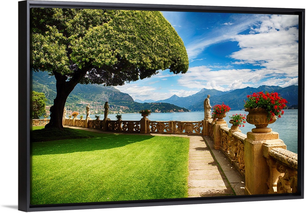 <p>Potted plants in stone vases on a terrace at the edge of Lake Como, Italy.</p>