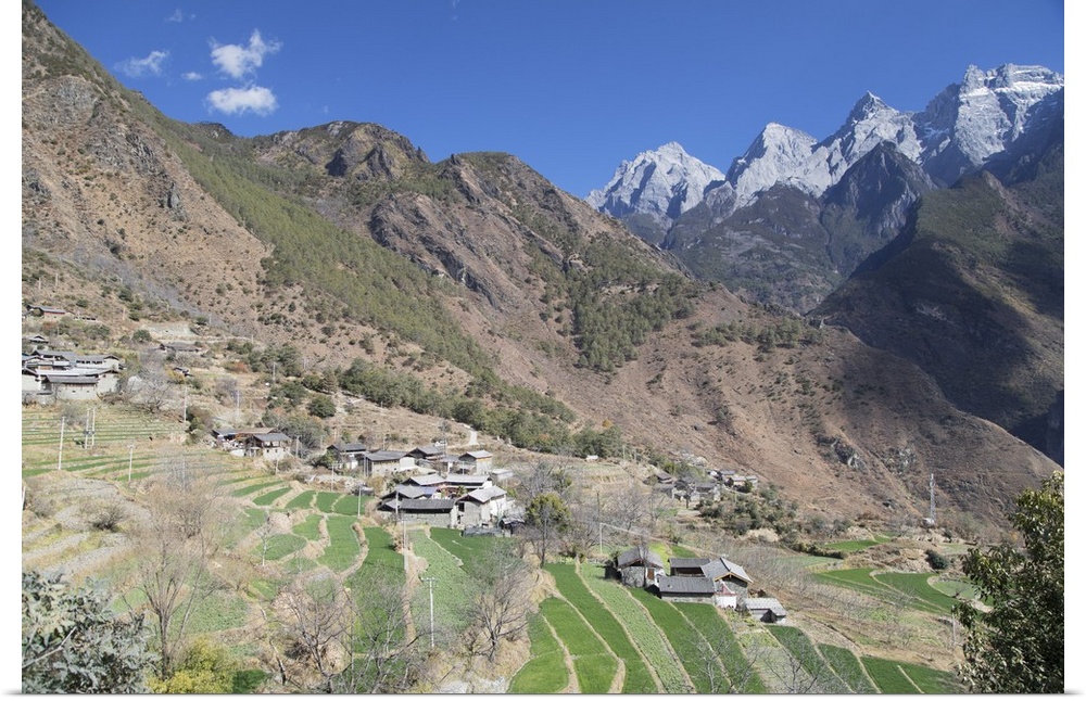 <p>Village in Tiger Leaping Gorge and Jade Dragon Snow Mountain (Yulong Xueshan), Yunnan, China.</p>