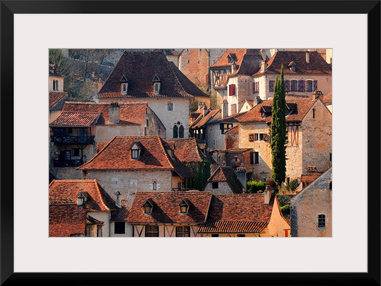 <p>Landscape photograph of the village of Saint Cirq Lapopie, at heart of historical Quercy region, in France. Many stone buildings with similar brown roof tops, fill a hillside.</p>