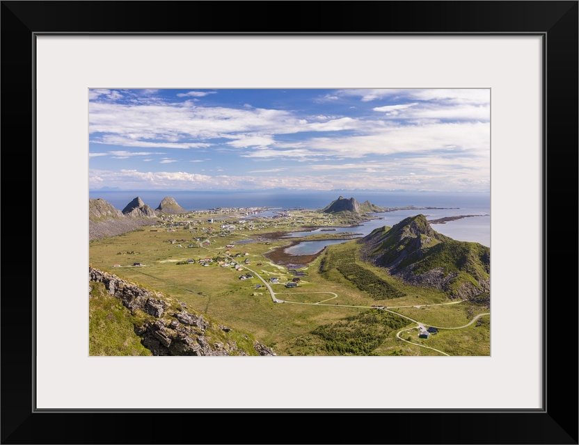 <p>View of village of Sorland framed by green meadows and sea, Vaeroy Island, Nordland county, Lofoten archipelago, Norway, Scandinavia, Europe</p>