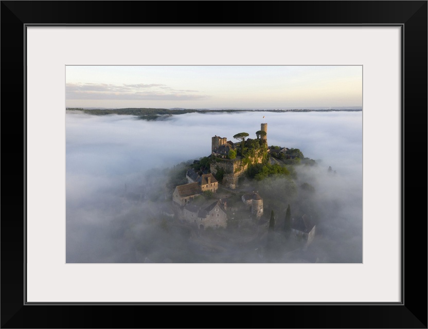 <p>An aerial view of the hilltop village of Turenne at sunrise surrounded by mist, Correze, Limousin, Nouvelle-Aquitaine, France, Europe</p>