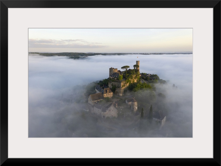 <p>An aerial view of the hilltop village of Turenne at sunrise surrounded by mist, Correze, Limousin, Nouvelle-Aquitaine, France, Europe</p>