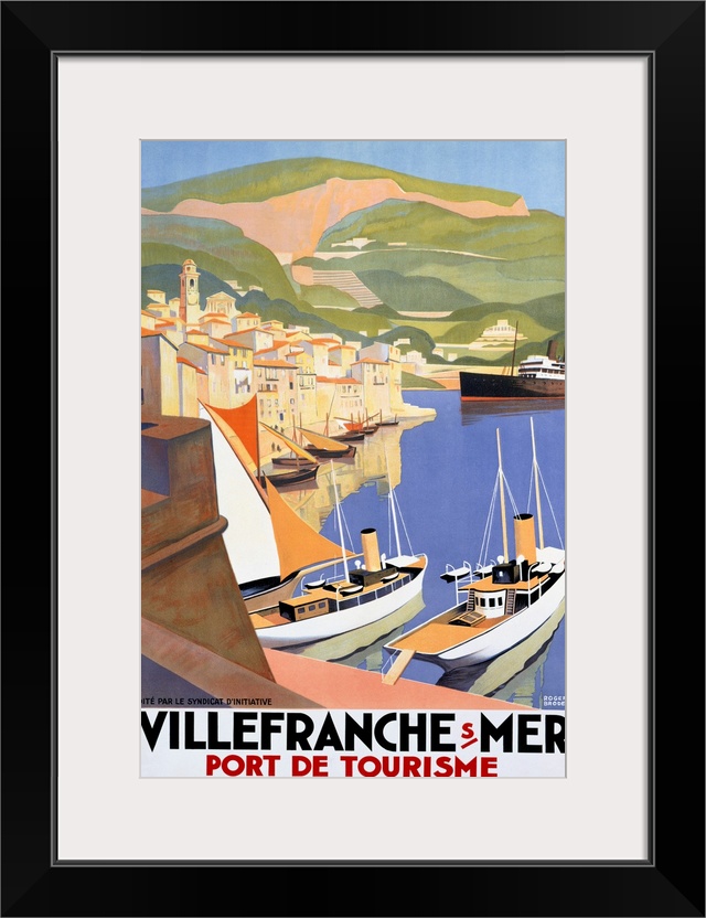 <p>Large vertical vintage poster showing ships in the water at a port city and large green hills in the background.</p>