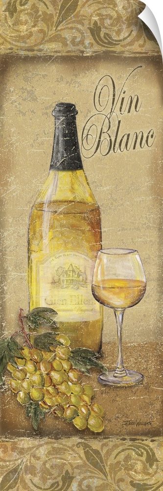 <p>Tall illustration of a wine bottle and a glass of white wine with grapes on the side on a tan background with "Vin Blanc" written at the top.</p>