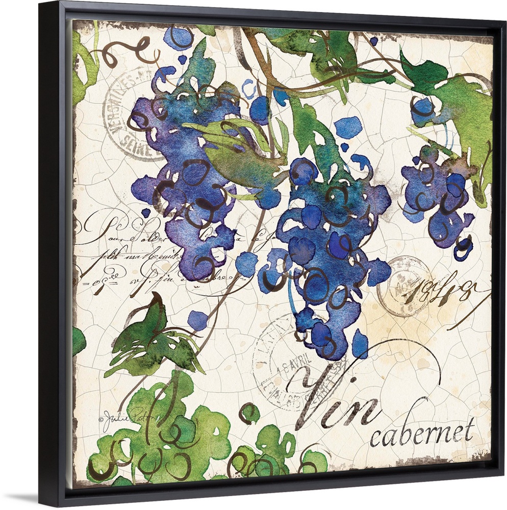 <p>Square wine decor with a watercolor painting of purple and green grapes on a cracked background with with brown Italian text.</p>
