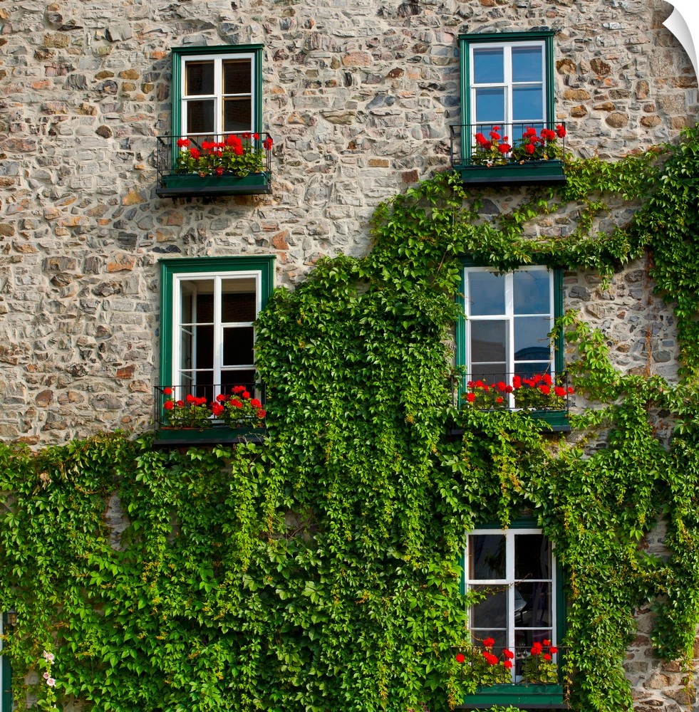 <p>Vine covered stone house and windows, Quebec City, Quebec, Canada</p>