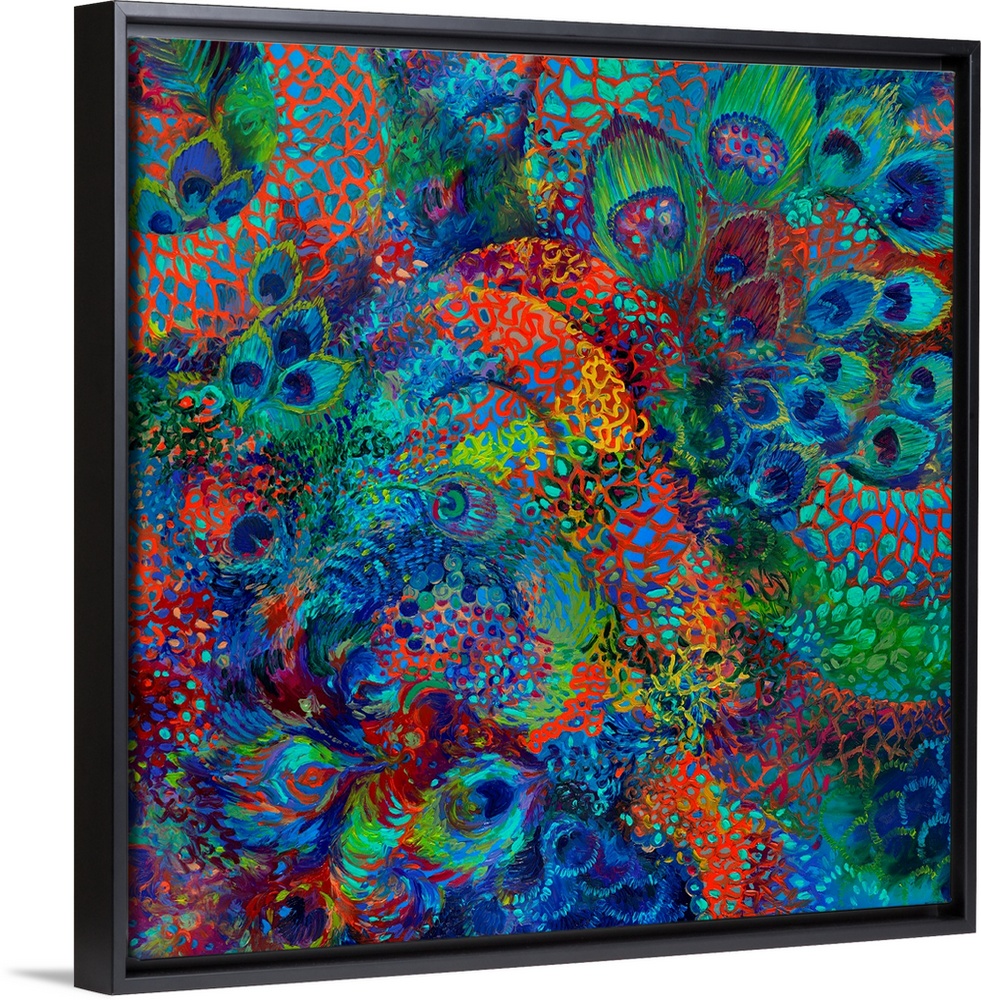 <p>Brightly colored contemporary artwork of colorful peacock feathers.</p>