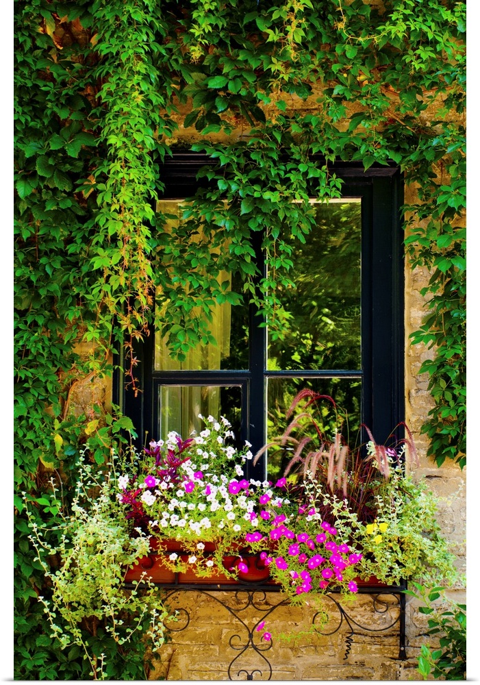 <p>Vines Growing On A Wall And Flowers In A Window Box, Quebec City, Quebec, Canada</p>