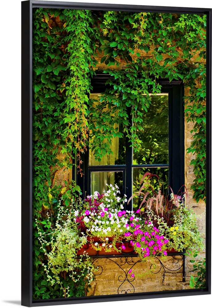 <p>Vines Growing On A Wall And Flowers In A Window Box, Quebec City, Quebec, Canada</p>